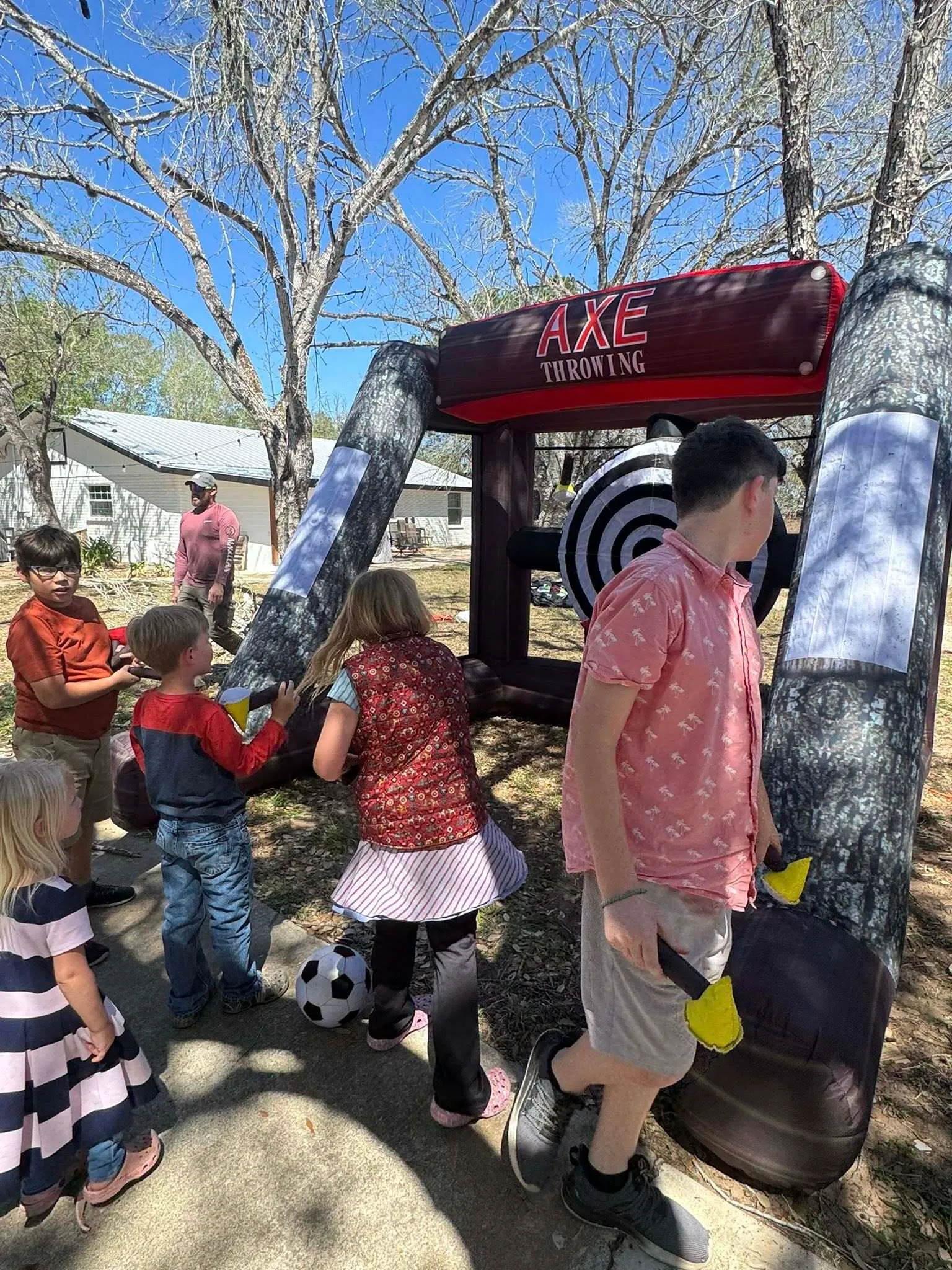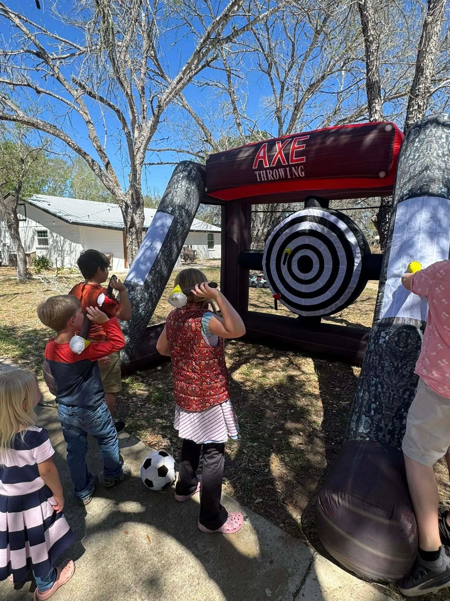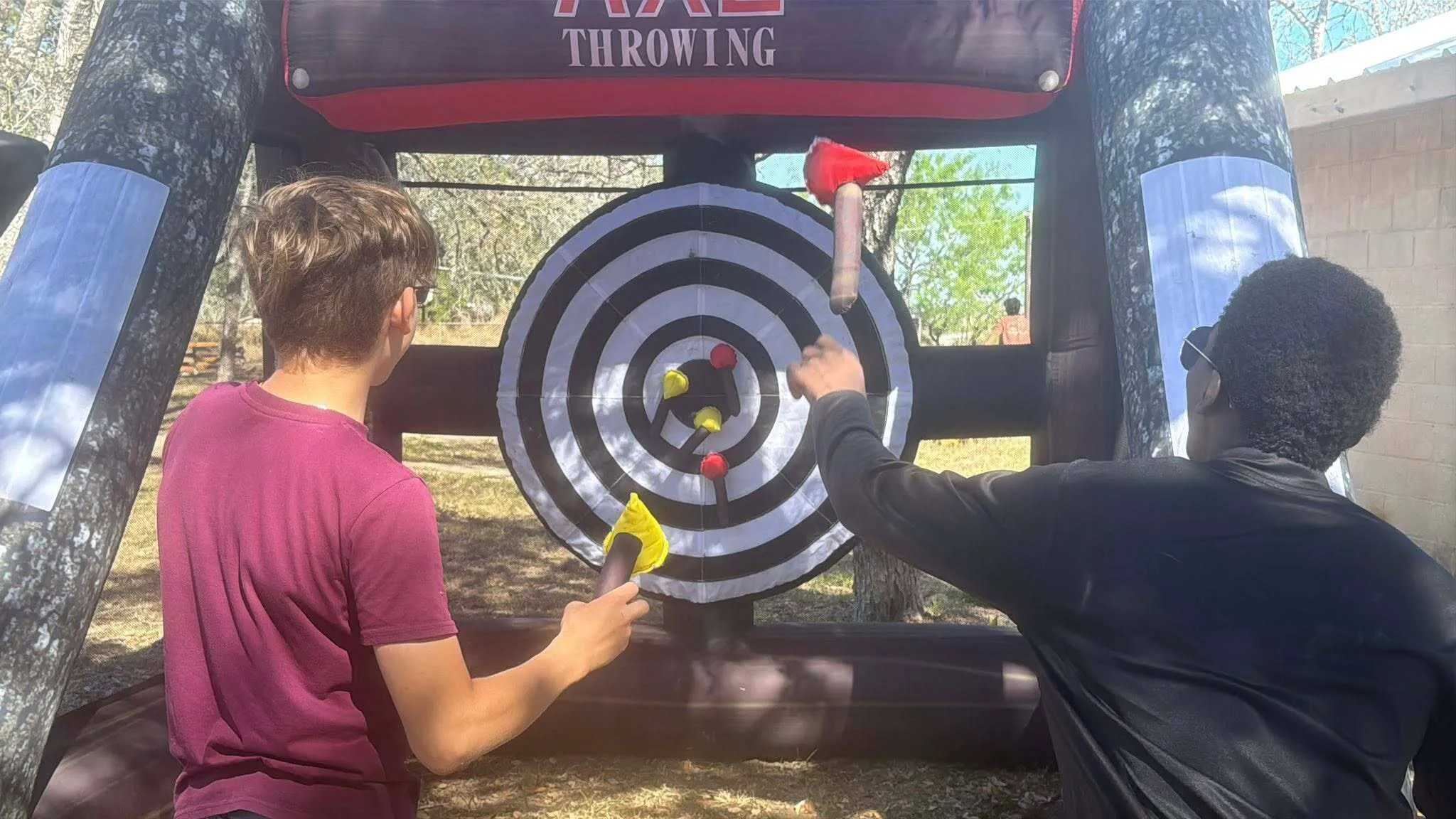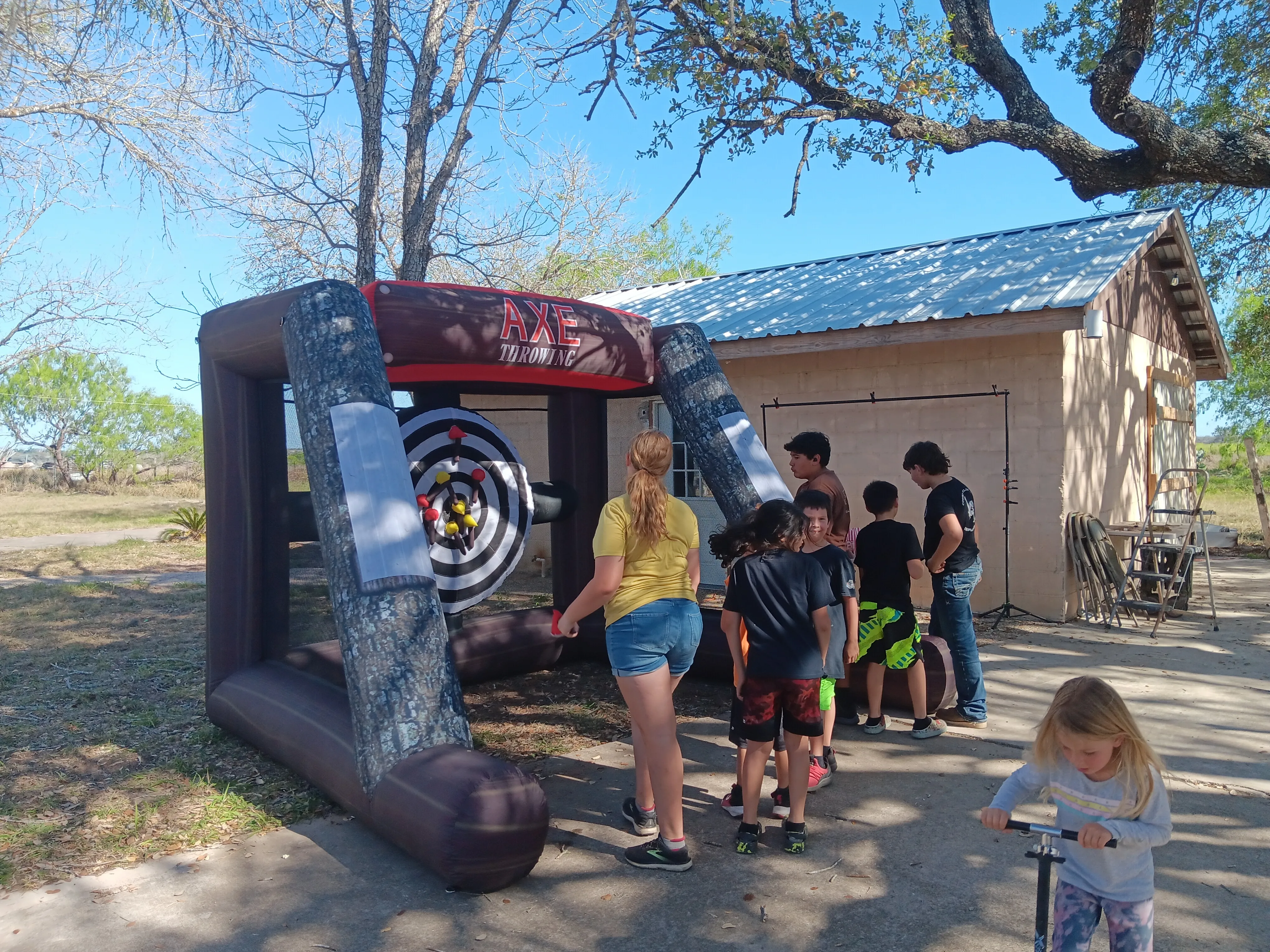 This safe and fun version of axe throwing uses soft foam axes that stick to the inflatable target, making it perfect for birthday parties, backyard parties, school events, church events, corporate events, and family gatherings.